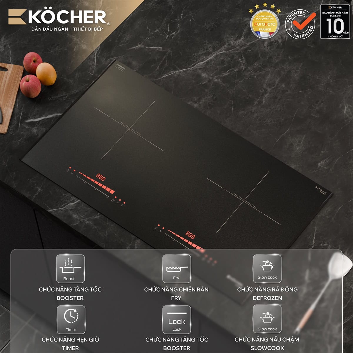 Là sản phẩm của thương hiệu Kocher, được khẳng định bởi hợp tác quốc tế với các tập đoàn vật liệu và linh kiện hàng đầu (EuroKera, E.G.O.) qua đó đảm bảo chất lượng tiêu chuẩn châu Âu.