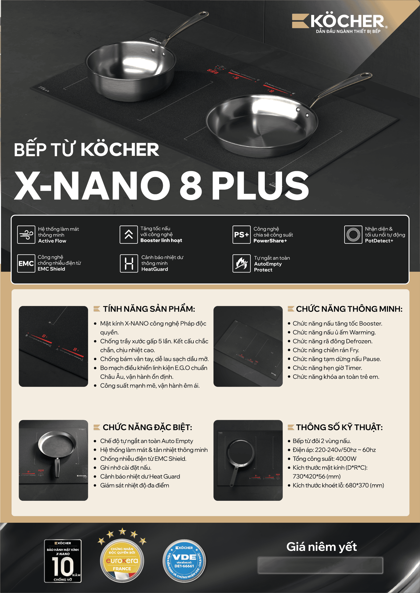 Trong phân khúc bếp từ cao cấp dành cho gia đình hiện đại, mẫu Kocher X-NANO 8 PLUS xuất hiện như một lựa chọn nổi bật kết hợp giữa thẩm mỹ sang trọng và công nghệ thông minh. Với mặt kính công nghệ X-NANO từ Pháp, thiết kế bo viền nhôm, và hàng loạt tính năng hỗ trợ nấu ăn nhanh – an toàn – tiện lợi, mẫu bếp này xứng đáng là “trợ thủ” đắc lực cho căn bếp của bạn.