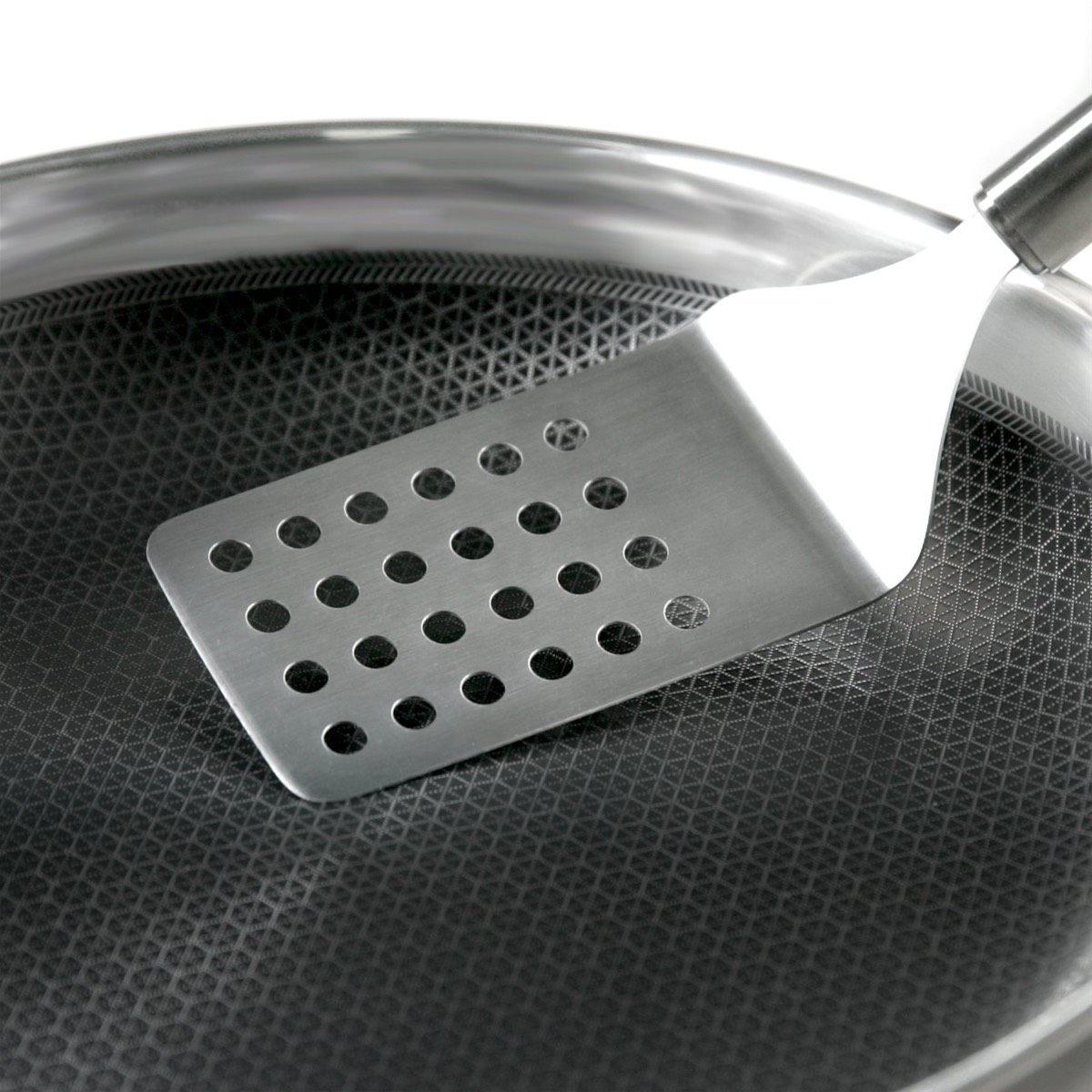 Tay cầm làm từ inox chắc chắn, thiết kế cách nhiệt tối ưu, tích hợp ở cuối tay cầm có lỗ treo cho bạn bảo quản chảo gọn gàng, tiện lợi.