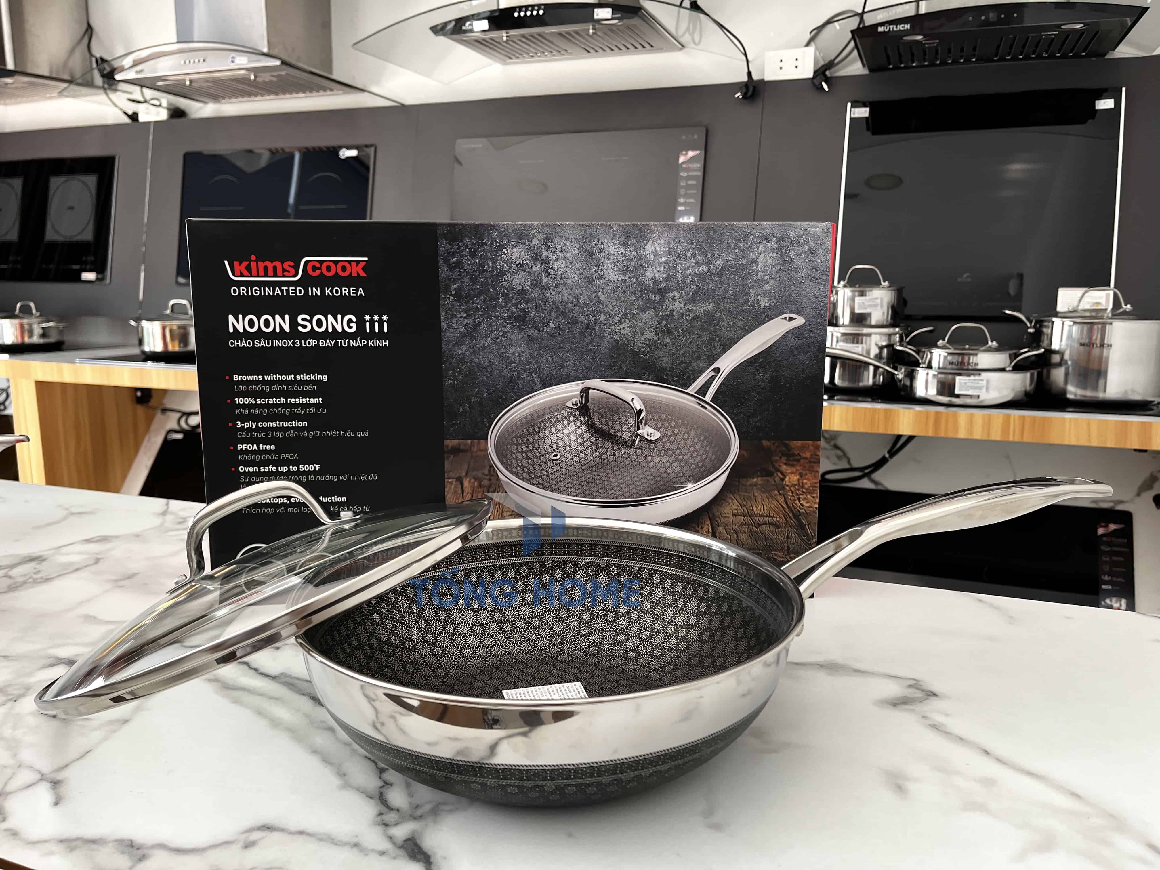 Chảo chiên/xào Inox lòng sâu Noon Song kèm nắp kính có cấu trúc inox 3 lớp, vỏ ngoài là Inox 430 để bắt từ, thích hợp với mọi loại bếp Từ kể cả những bếp kén chảo, lớp giữa dầy 1.2mm là nhôm để dẫn và giữ nhiệt, lớp trong tiếp xúc với thực phẩm là Inox 304 tốt cho sức khoẻ.