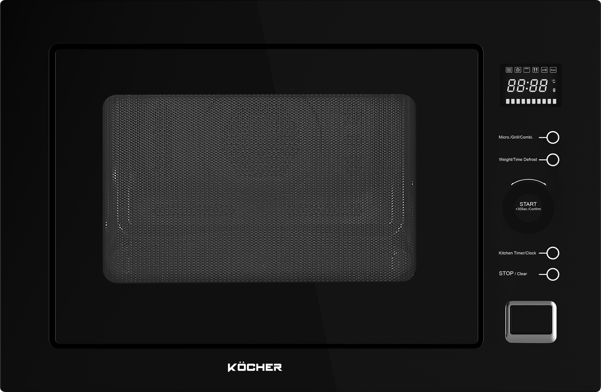 Lò vi sóng Kocher KMEU-1025 gây ấn tượng mạnh với thiết kế âm tủ, thích hợp cho khoang tủ bếp 38cm, giúp tiết kiệm diện tích và tạo nên vẻ đẹp liền mạch, sang trọng cho căn bếp. Vỏ ngoài được làm từ vật liệu inox 304 (18/10) cao cấp kết hợp kính cường lực màu đen, không chỉ chống bám bẩn, vân tay hiệu quả mà còn mang lại vẻ ngoài cuốn hút và đẳng cấp.