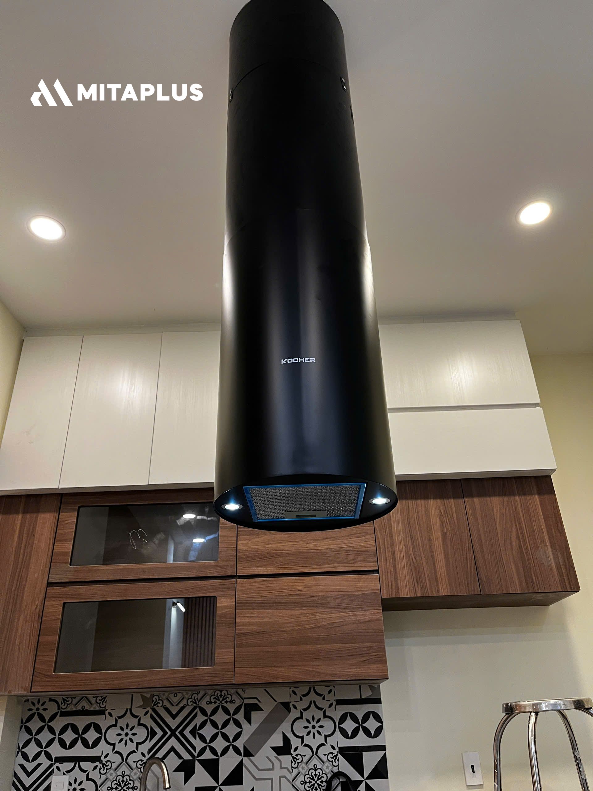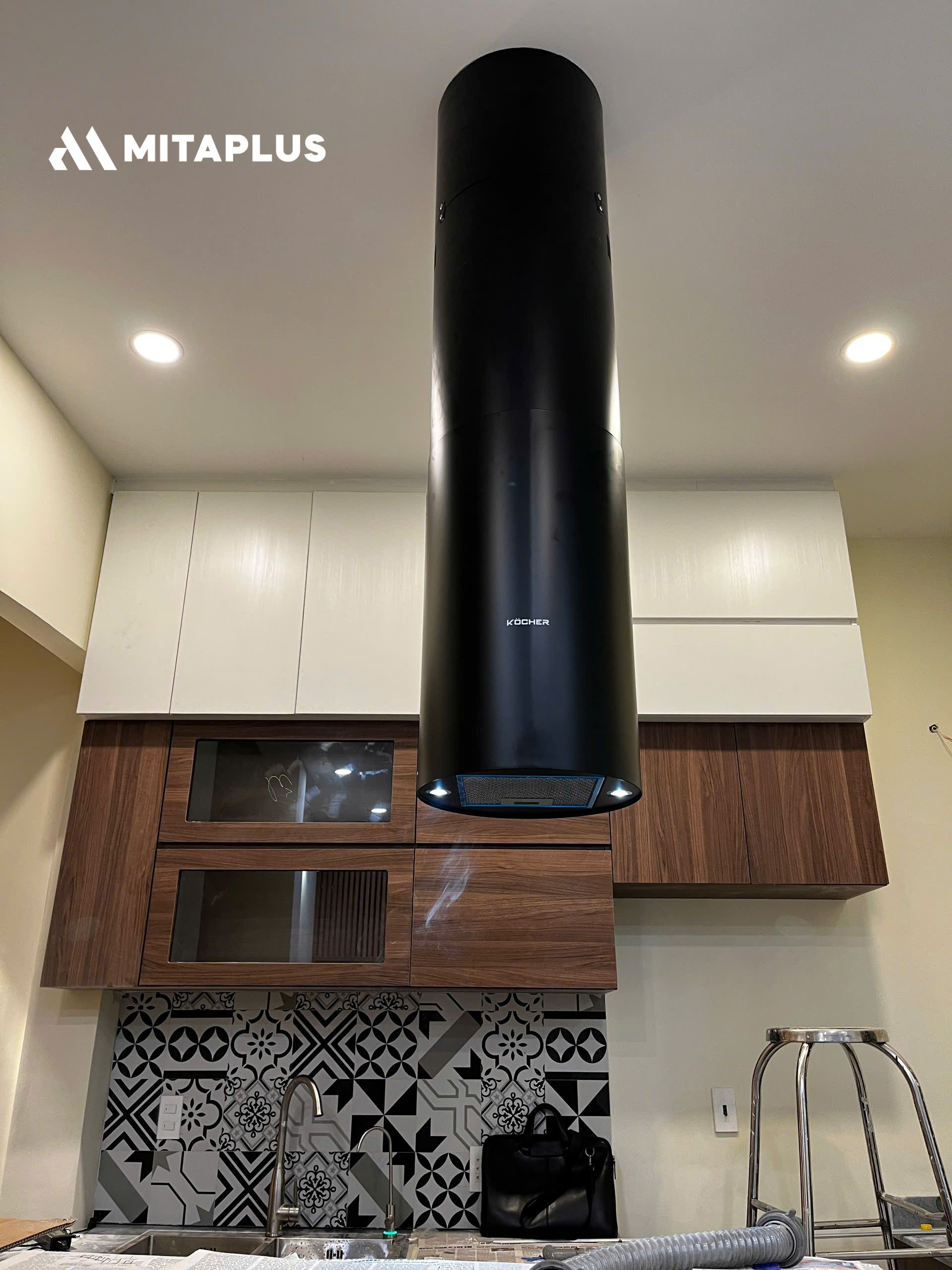 - Thiết kế hút mùi đảo dạng ống: Phù hợp với không gian bếp rộng, hiện đại.